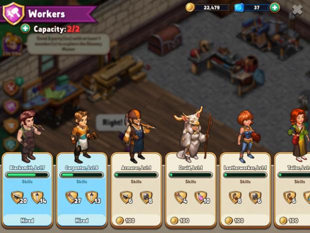 Bước vào thế giới Shop Heroes với việc sở hữu một gian hàng nhỏ trong thị trấn, các game thủ sẽ bắt đầu phát triển cửa hàng của mình bằng cách thuê các tay thợ lành nghề để chuẩn bị cho công việc sản xuất. Có rất nhiều các loại thợ khác nhau, từ thợ mộc, thợ sắt, thợ thuộc da cho đến các thợ chuyên sản xuất vũ khí, khiên giáp,…Tùy theo quy mô của cửa hàng mà người chơi sẽ có thể chiêu mộ một số lượng nghệ nhân có trình độ tay nghề nhất định. Do vậy, bạn cần cân nhắc xem ban đầu mình sẽ chuyên bán loại mặt hàng nào để thuê thợ cho phù hợp.