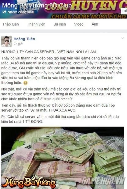 Ps: Cân tất cả server và tìm một đối thủ xứng tầm chịu chi với số tiền dự kiến bỏ ra là 1 TỶ ĐỒNG.”