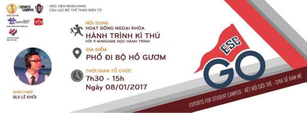 Sau 1 thời gian chuẩn bị với sứ mệnh gắn kết,tạo điều kiện giao lưu và chia sẻ kinh nghiệm các bạn đang phát triển phong trào thể thao điện tử tại các trường trên địa bàn Hà Nội, được sự bảo trợ của cộng đồng phát triển phong trào thể thao điện tử sinh viên ESC Việt Nam, chương trình 'Hành trinh kỳ thú ESCGO' sẽ được tổ chức vào 7h30 ngày 08/01/2017 tại đài phun nước phố đi bộ Hồ Hoàn Kiếm.