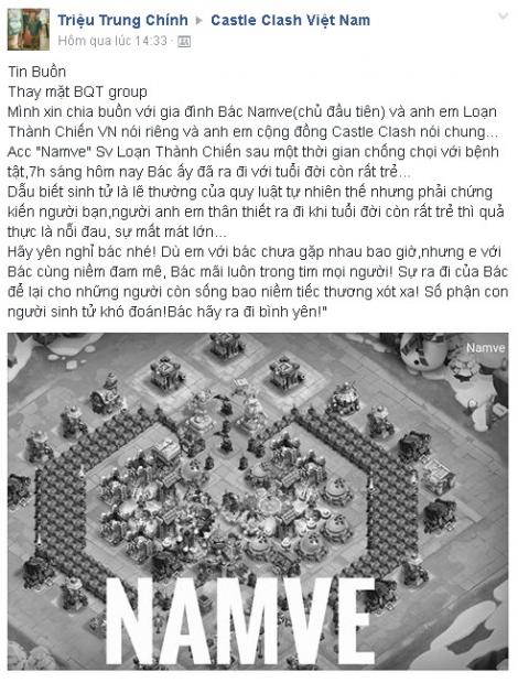 Mới đây, cộng đồng người chơi Castle Clash tại Việt Nam đã bày tỏ niềm tiếc thương tới chủ tài khoản Namve, một game thủ khá có tiếng trong tựa game mobile online này. Được biết, Namve đã qua đời vì bạo bệnh sau một thời gian dài chống chọi với bệnh tật, anh đã ra đi với tuổi đời còn khá trẻ.
