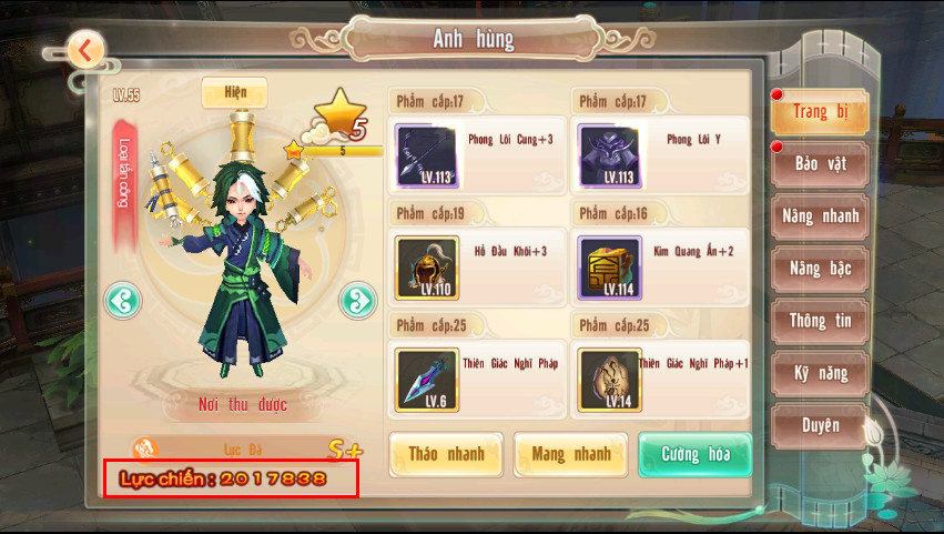 2. Cường hóa trang bị: Mỗi vị tướng sẽ có 3 trang bị và mỗi trang bị sẽ tăng những thuộc tính khác nhau như Vũ khí tăng tấn công, Áo giáp tăng vật phòng và pháp phòng, Ngọc bội sẽ tăng sinh mệnh. Khi cường hóa trang bị thì chỉ số các thuộc tính của tướng tăng , và đồng thời cũng tăng Lực chiến của tướng.