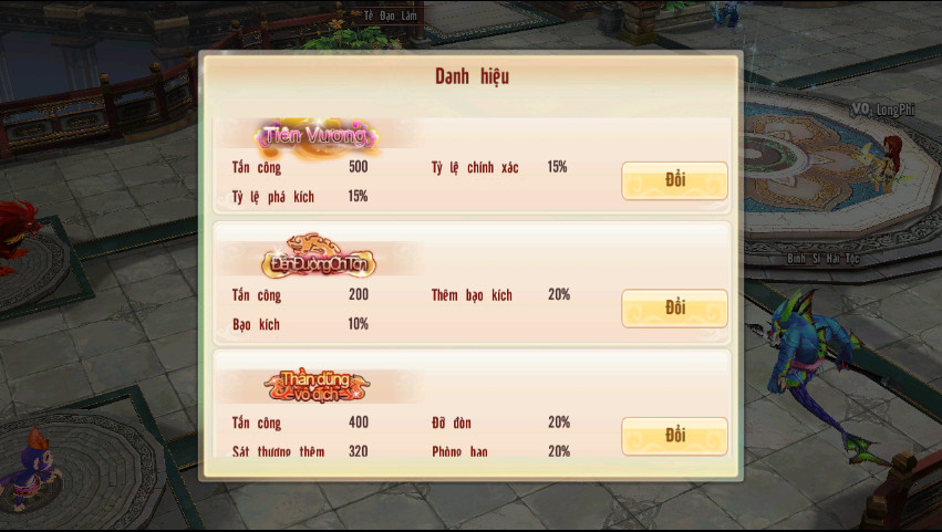 7. Danh hiệu: Danh hiệu khác nhau sẽ mang lại hiệu quả cộng thêm khác nhau cho đội, người chơi có thể chọn danh hiệu hiển thị và hiệu quả cộng thêm trong giao diện thông tin nhân vật. Có thể lấy các Danh Hiệu ở các hoạt động Đại Chiến Boss Bang, Chiến Vực Thần Ma, Mô Bái.