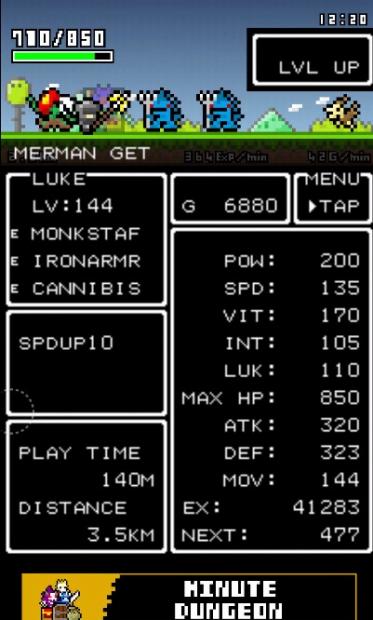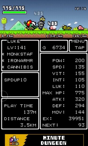 Điểm gây ấn tượng lớn nhất trong MinuteQuest lại đến từ lối chơi, ban đầu tôi nghĩ đây là một tựa game chạy vô tận nhưng càng ngày yếu tố nhập vai càng được hiển thị rõ. Khi bắt đầu chơi, bạn chỉ có thanh kiếm nhỏ trong tay và tiêu diệt lũ quái vật phía bên ngoài lâu đài để tăng kinh nghiệm chiến đấu và kiếm lượng tiền thưởng. Về cơ bản, game thủ chỉ việc chạm màn hình về 2 phía để lựa chọn hướng di chuyển, gặp kẻ thù thì nhân vật sẽ tự động tấn công tới khi chúng bị tiêu diệt. Đôi khi may mắn, bạn sẽ bắt được những con quái vật mà mình đã tiêu diệt và thuần hóa chúng làm kẻ theo sau.