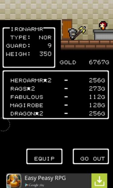 Hệ thống trang bị vô cùng đa dạng và cũng chính là tính năng khiến tôi phải đau đầu. Khi mới chơi, tôi không hề biết rằng trong MinuteQuest những trang bị đi theo bộ sẽ có những thuộc tính bị động khác nhau. Chính vì vậy, trên con đường phiêu lưu của mình bạn sẽ gặp những shop bán vũ khí và áo giáp. Hãy luyện cấp đồng thời kiếm tiền đến khi nào mua được tất cả hàng hóa trong shop đó rồi hãy đi tiếp. Và đừng quên, có những căn nhà sẽ tự động sắp xếp trang bị đi theo bộ để bạn dễ dàng lựa chọn.