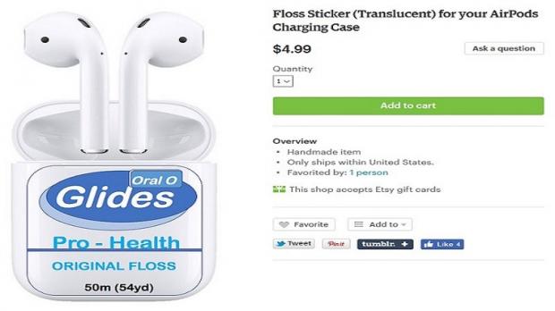 Nếu để ý kỹ, bạn sẽ thấy phần đế sạc của AirPods trông khá giống một hộp chỉ nha khoa. Chính vì vậy, Etsy đã ra mắt một miếng dán đặc biệt giá 4,99 USD (khoảng 115 ngàn đồng) để giúp biến đế sạc AirPods thành một hộp chỉ nha khoa mang thương hiệu Oral.