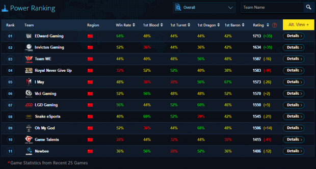 Tham khảo BXH của 11 đội tuyển tham dự LPL Mùa Xuân 2017 (QG không có tên do mới thăng hạng), theo trang thống kê và phân tích LOL Matrix: