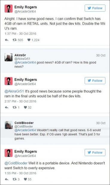 Bản thân Emily Rogers cho rằng điều đó chưa hẳn đã đúng, vì 'ông lớn' Nhật Bản không muốn mọi người nghĩ Switch là một hệ Console, mà hướng sản phẩm này tới thị trường máy game cầm tay, do đó 4GB là đủ để đáp ứng nhu cầu game thủ, đồng thời giúp giảm mức giá thành.