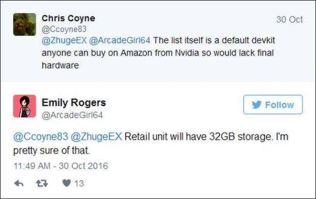 Nintendo Switch sẽ có 32GB bộ nhớ trong - Nguồn: Twitter