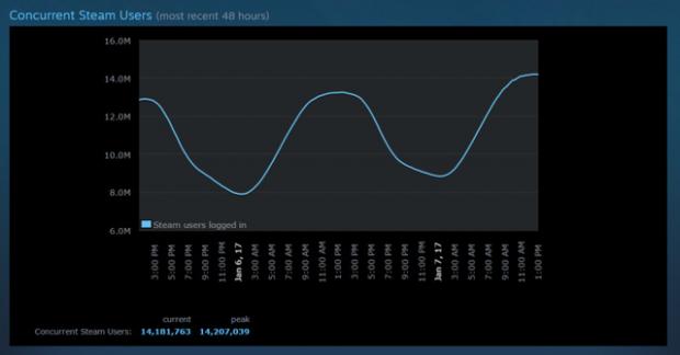 Vào ngày 7/1 hôm qua, hệ thống Steam của Valve lại tiếp tục vượt qua một cột mốc mới về số lượng người dùng, cụ thể là 14,2 triệu game thủ online cùng lúc. Thành tích mới này đạt được một thời gian ngắn sau khi đợt khuyến mại giảm giá Winter Sale kết thúc vào ngày 3/1.
