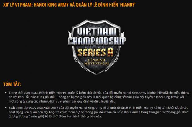 Hanoi King Army là đội tuyển Liên Minh Huyền Thoại đến từ thủ đô Hà Nội, quản lý đứng tên là Lê Đình Hiển (Hianry). Ngày 7/1/2017, ban tổ chức VCSA ra thông báo xử phạt Hanoi King Army vì đội tuyển này có những liên quan đến các tổ chức không mình bạch, vi phạm quy định giải đấu. Theo một số tin đồn, người đứng sau Hanoi King Army không ai khác chính là King of War - ông trùm cày thuê số một Việt Nam.