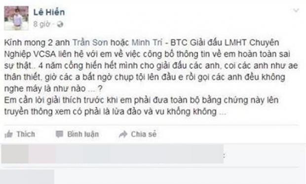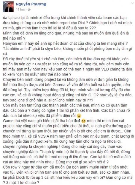 Qua status này, có thể thấy rõ Hanyian chỉ trích Phương Top chính là người đứng sau, đem bằng chứng Hanoi King Army tố cáo lên Riot Games. Có đầy đủ bằng chứng trong tay, quá dễ hiểu khi đội tuyển đến từ thủ đô Hà Nội bị ban thẳng tay khỏi giải.