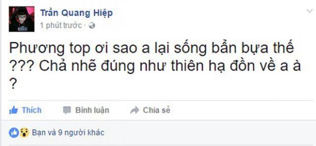 Ngay sau đó, Phương Top cũng đăng đàn phản pháo Hanyian, cho rằng chính cựu tuyển thủ của Saigon Jokers là người tuồn bằng chứng cho mình trước đây. Giờ này lại nói mình 'xì đểu', thế là không đúng.