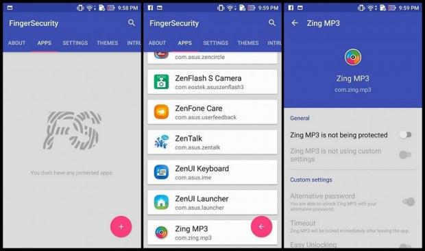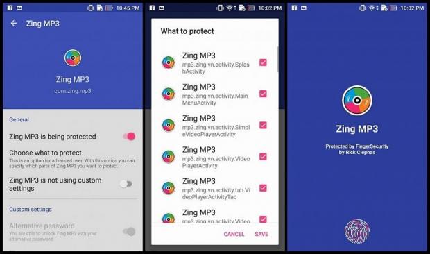 Nếu bạn đã kích hoạt Improved Protection ở phần cài đặt, thì chúng ta có thể chọn khoá từng phần riêng biệt của ứng dụng, sau khi thiết lập mọi thứ xong, bạn đã có thể dùng vân tay để mở khoá ứng dụng