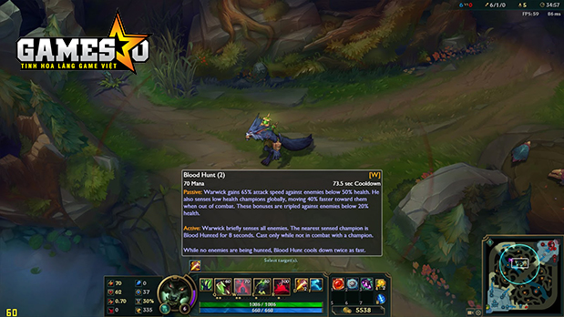 Kích hoạt – Warwick ngay lập tức cảm nhận được tất cả kẻ địch. Vị tướng gần nhất bị phát hiện bởi Mùi Máu trong vòng 8 giây. Kích hoạt chỉ sẵn sàng khi không giao tranh với tướng địch.