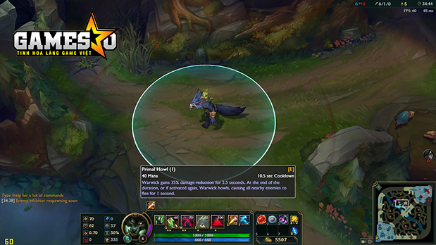 Warwick nhận 35/40/45/50/55% khả năng giảm sát thương trong vòng 2.5 giây. Khi kết thúc quá trình, hoặc tiếp tục tái kích hoạt, Warwick hú lên, gây hoảng sợ cho tất cả kẻ địch xung quanh trong vòng 1 giây.