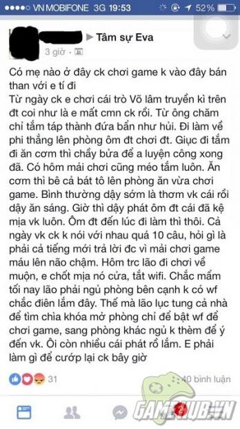Từ ngày chồng em chơi cái Võ Lâm Truyền Kì trên điện thoại coi như em mất chồng rồi. Từ ông chăm chỉ tắm táp thành đứa bẩn như hủi. Đi làm về phi thẳng lên phòng ôm điện thoại chơi điện tử. Giục đi tắm, đi ăn cơm thì chầy bửa để anh luyện công xong đã. Có hôm mải chơi cũng không thèm tắm luôn. Ăn cơm thì bê cả bát tô lên phòng vừa ăn vừa chơi game. Bình thường dậy sớm là thơm vợ cái rồi dậy ăn sáng. Giờ thì dậy phát ôm cái điện thoại cái đã, kệ vợ luôn. Ôm điện thoại đến lúc đi làm thì thôi. Cả ngày vợ chồng không nói với nhau quá 10 câu, hỏi gì là phải cả tiếng mới trả lời được vì mải chơi game, máu lên não chậm. Hôm trước lão đi chơi về muộn, em chốt luôn cửa, tắt wifi. Chắc mẩm tối nay lão phải ngủ phòng bên cạnh không có wifi chắc điên lắm đây. Thế mà lão lục tung cả nhà để tìm chìa khóa mở phòng chỉ để bật wifi chơi game, sang phòng khác ngủ không thèm để ý đến vợ. Ôi nhiều cái phát rồ lắm. Em phải làm gì để cướp lại chồng bây giờ”.