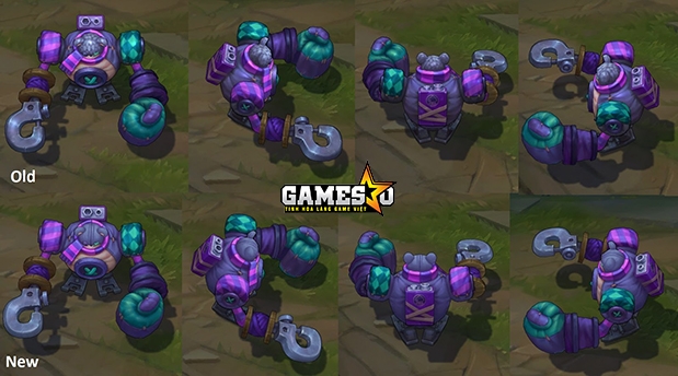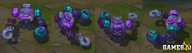 Sewn Chaos Blitzcrank có sự thay đổi về màu sắc, tinh chỉnh đầu và móc kéo.