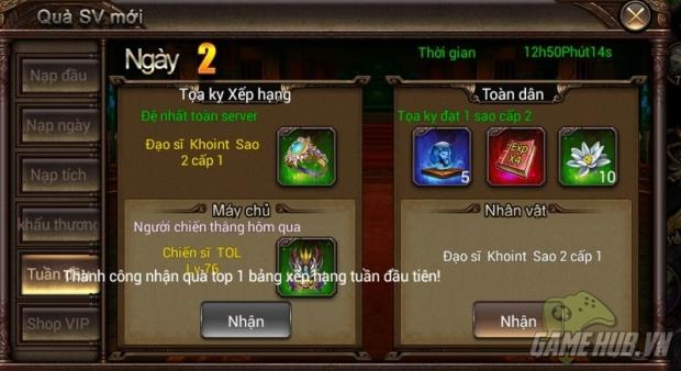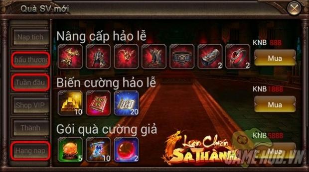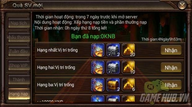 Hạng nạp: Trong bảy ngày đầu tiên khai mở server, những người đầu tiên đạt được những mốc nạp KNB nhất định sẽ nhận được những phần quà cực kỳ có giá trị.