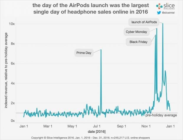 Tuy nhiên, Apple có một lợi thế là tất cả những người mua iPhone 7, 7 Plus trong thời gian qua đều là khách hàng tiềm năng của AirPod (vì 2 chiếc điện thoại này đã loại bỏ jack cắm tai nghe 3.5mm). Trong ngày 13/12 vừa qua (ngày AirPod lên kệ), hầu hết doanh số bán tai nghe trực tuyến là tai nghe không dây.