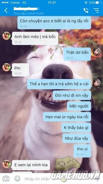 “Khổ chủ” trong bi kịch trên là một nữ game thủ Au Mobile, sau một hai lần thật thà cho thanh niên này vay tiền mua fam, nghĩ tin tưởng nên cho vay thêm tiếp 2 triệu rưỡi mua acc mới. Mặc dù có đôi chút nghi ngờ vì chỉ là người quen qua game nhưng cũng không để bụng lắm. Sau cô nàng có đòi nhiều lần nhưng thanh niên này lấy đủ lý do để khất hẹn, nói đang ở nước ngoài giải quyết công việc. Nhưng không phải với thái độ “dễ chịu” mà còn lên mặt thách thức “khổ chủ” bóc phốt và tuyên bố… “đừng trẻ con, anh không phải thằng lừa đảo”.