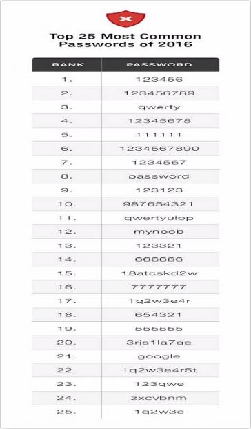 Danh sách 25 mật khẩu phổ biến nhất năm 2016.