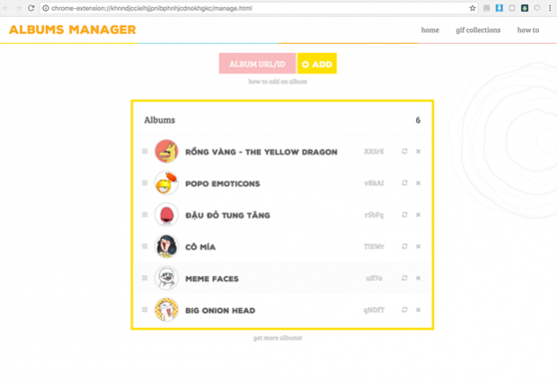 Sau đó vào link bộ sưu tập các emotion của GIFUR theo link sau. Đưa chuột vào bộ sticker rồng vàng và nhấn nút Add Album.