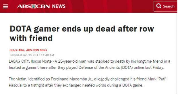 Trên số ra ngày 15/1 của nhật báo Philippines ABS-CBN, một người đàn ông 25 tuổi có tên Ferdinand Madamba Jr đã bị sát hại dã man tại một tiệm cafe internet ở thành phố Laoag, tỉnh Llocos Norte. Theo ghi nhận của cảnh sát, nạn nhân bị sát hại bởi chính người bạn thân 10 năm sau một cuộc xích mích khi chơi game Defense of the Ancients (DotA 2).