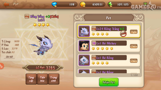 Chăm sóc Pet tốt cũng góp phần tăng lực chiến cho nhân vật