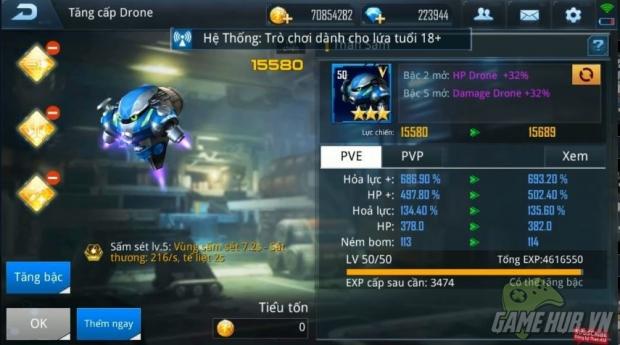 Ngoài tăng cấp và tăng bậc, game thủ còn có thể khảm đá để tăng lực chiến cho Drone và để nhận được sự hỗ trợ tốt nhất cho từng chế độ chơi.Lực chiến hiển thị bên cạnh nhân vật trong các chế độ như AI Boss là lực chiến của Drone, chỉ số lực chiến này có thể được tăng thêm nhờ vào tăng cấp, tăng bậc và khảm đá cho Drone.
