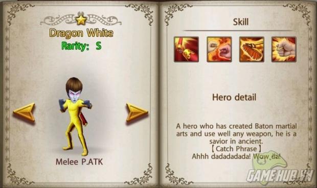 Dragon White có võ nghệ cao cường, anh không ngán bất kỳ một đối thủ nào. Với song tiết côn, Dragon White sẽ tạo 6 đợt sát thương cho kẻ địch, trong đợt tấn công cuối cùng Dragon white có thể hạ knock out kẻ địch có HP thấp hơn 20%. Khi trở thành Follower, Dragon White giúp tăng thêm 60% thuộc tính tấn công vật lý cho đồng đội.