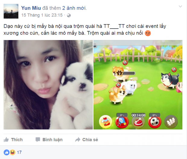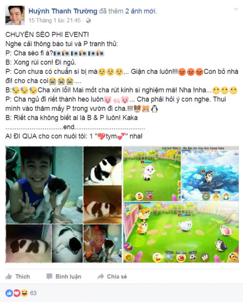 Cũng “ăn theo” trào lưu khoe pet, bạn Thanh Trường (sinh viên trường Cao Đẳng Y Tế Cần Thơ) dí dỏm chia sẻ “Mình thích động vật lắm. Phòng trọ kế bên có con chó, cứ mỗi tối là nó qua gõ cửa phòng mình. Giờ mình có một đàn chó luôn, là trong Nông Trại Vui Vẻ ấy, hihi. Cứ rảnh lúc nào là vào thăm vườn và các em ấy lúc đấy. Nhưng đêm thì vẫn cứ đều đặn vào… ăn trộm hehe.”