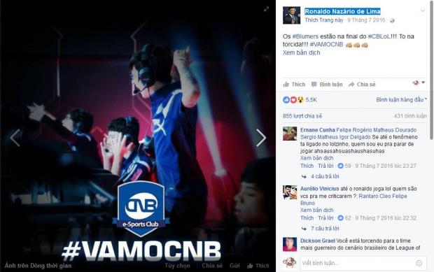 Ronaldo từng để ngỏ khả năng đầu tư vào Liên Minh Huyền Thoại từ giữa năm 2016 khi huyền thoại này đăng bức ảnh cổ vũ cho Blumers (tên mà các cổ động viên hay gọi CNB e-Sports Club) trong trận đấu với đội tuyển INTZ e-Sports tại giải đấu CBLOL.