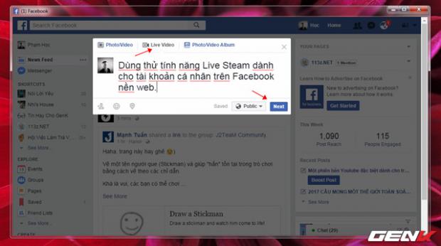 Tiếp tục nhấp vào tab “Live Video” lần nữa, rồi nhập nội dung status vào đó. Và nhấp vào “Next”.