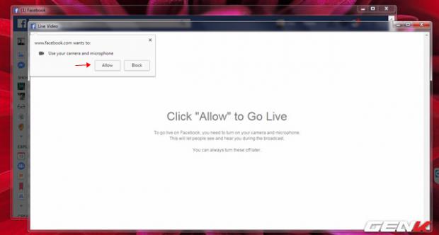 Một cửa sổ Chrome mới sẽ mở ra, yêu cầu bạn cho phép Facebook truy cập vào thiết bị webcam của máy tính để phát hình. Hãy nhấp “Allow” để cho phép.