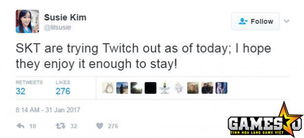 “SKT đang thử nghiệm trên Twitch ngày hôm nay”, đại diện của Twitch Hàn Quốc, Susie Kim tweet. “Tôi hy vọng họ đủ thích thú nó để ở lại.”