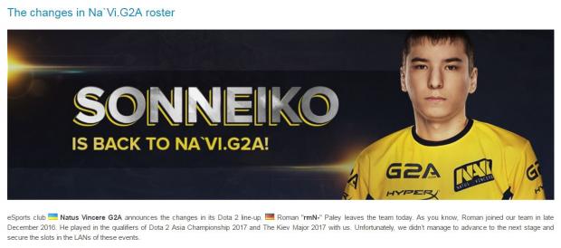SoNNeikO rời Na`Vi vào tháng 11 năm ngoái sau khi tổ chức này tái thiết lại đội hình xoay quanh hai chủ lực là Danil 'Dendi' Ishutin và Victor 'GeneRaL' Nigrini. Tổ chức đã thất bại tại vòng loại Kiev Major và Dota 2 Asia Championship 2017.