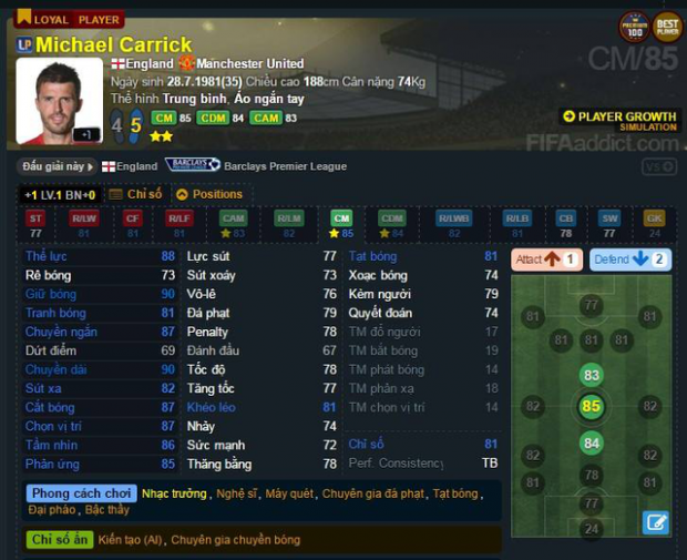 Ngoài CAM, thì CM hay CDM cũng là vị trí thi đấu vô cùng phù hợp cho Carrick LP. Tuy không dành được gianh hiệu lớn nào với tuyển quốc gia nhưng 11 năm thi đấu cho MU tới lúc này đã cho thấy sự bền bỉ, ổn định của anh. Trong game, thì hầu như không mấy ai dùng Carrick, phiên bản LP như một sự “vực dậy” cầu thủ người Anh trong mắt mọi người chơi.