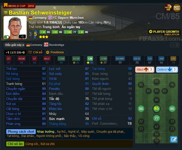 Cầu thủ người Đức với khả năng kiểm soát bóng tuyến giữa bậc thầy, vai trò của anh tại Bayer Munich trước đây cũng quan trọng như Xavi với Barcelona vậy. Chuyền và phát động tấn công là những điểm mạnh của phiên bản WC10 – phiên bản đỉnh cao của Schweinsteiger. Đây là mẫu cầu thủ cũng rất ít người chơi sử dụng.