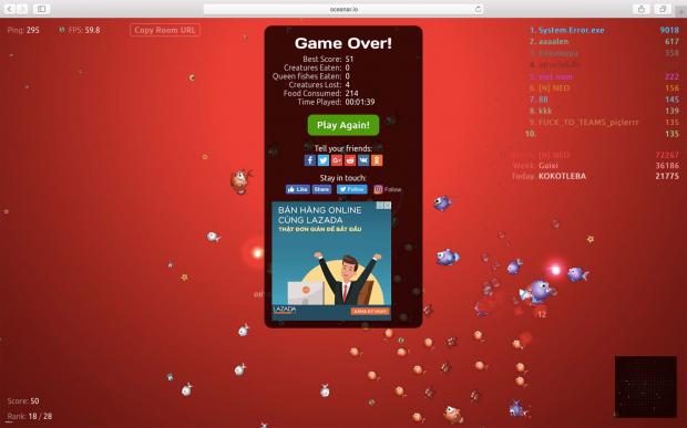 Trong Oceanar.io, chúng ta không là những con rắn vừa dài vừa thon dễ gây hiểu lầm nữa, mà sẽ là những chú cá tung tăng. Và như Slither.io, việc đầu tiên mà bạn cần làm vẫn là ăn thật nhiều những thứ linh tinh xung quanh.