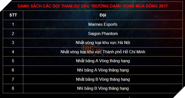 Tại giải đấu lần này, số lượng đội tham dự vẫn giữ nguyên ở con số 8 nhưng tổng trị giá giải thưởng đã được tăng lên thành 800.000.000 đồng. Bên cạnh đó, các tuyển thủ tham dự giải mùa đông 2017 sẽ bắt đầu được hỗ trợ trả lương trong khoảng thời gian thi đấu. THÔNG TIN GIẢI ĐẤU Đấu Trường Danh Vọng (ĐTDV) mùa đông 2017 sẽ chia làm 3 giai đoạn (Tham khảo thông tin về suất thăng hạng tại ĐÂY): Vòng loại: Thi đấu offline tại 2 thành phố là Hà Nội và Thành phố Hồ Chí Minh Thời gian: Ngày 02/09 - 03/09/2017. Thể thức: Bo3 loại trực tiếp. Suất thăng hạng: 2 đội đứng đầu vòng loại mỗi thành phố sẽ giành vé trực tiếp tham dự Đấu Trường Danh Vọng mùa đông 2017. 4 đội hạng 2 và 3 mỗi thành phố sẽ tiếp tục tranh tài tại Vòng thăng hạng để tìm kiếm cơ hội. Giải thưởng: