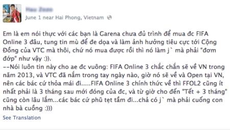 Theo tìm hiểu của RGN, chủ nhân của comment này chính là người đang giữ cương vị Chủ tịch Liên đoàn FIFA Online 2 Hải Phòng. Ngạc nhiên hơn, ngay từ ngày 01/06 (tức là cách đây nửa tháng), anh này này đã khẳng định rằng FIFA Online 3 đã được VTC 'nắm trong tay'. Nội dung chính xác của status này như sau: