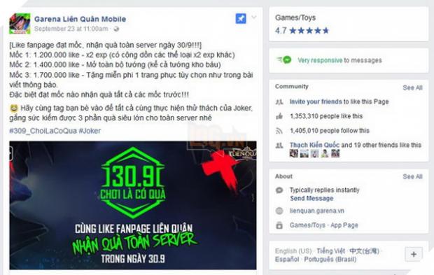 Fanpage đạt 1,7 triệu lượt like -> Nhận miễn phí 1 trang phục vĩnh viễn từ danh sách 10 trang phục cực chất của hội đồng Liên Quân vào ngày 30.9 (danh sách 10 trang phục sẽ được công bố khi fanpage đạt mốc tặng thưởng)