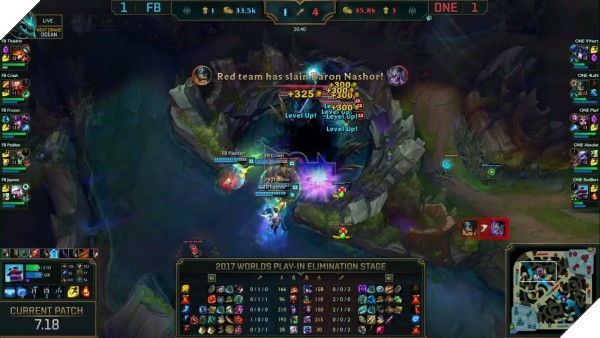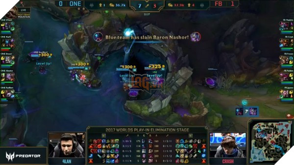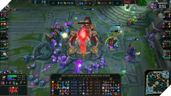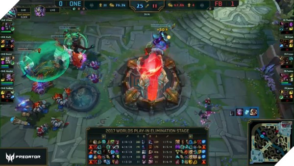 Pha giao tranh đặt dấu chấm hết cho ONE Sai lầm của ONE càng chồng chất sau pha giao tranh tổng thảm họa của họ tại đường trên. Tưởng rằng bắt được Crash khi anh chàng này lang thang ở bãi đá bên đội mình, ONE đã lao vào. Nhưng Frozen nhanh chóng dùng chiêu cuối còn Thaldrin dịch chuyển thẳng vào mắt gia nhập cùng đồng đội. Kết quả là FB có lợi thế về người và bốn thành viên của ONE đã phải nằm xuống. Từ đây thế trận đã rơi hoàn toàn vào tay FB, họ dần dần ép vào và phá nhà sau mỗi lần Frozen dùng chiêu cuối. Từng con rồng và cuối cùng là Baron rơi dần vào tay FB sau những pha đặt bẫy vô cùng thông minh đẩy ONE vào thế không vào không được. Trận đấu kết thúc sau 28 phút với lượng vàng cách biệt là 14k.