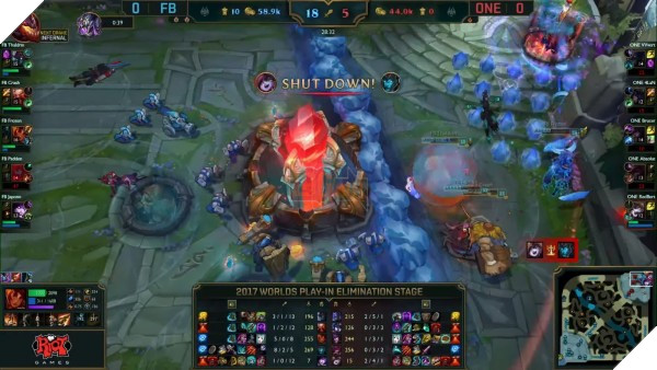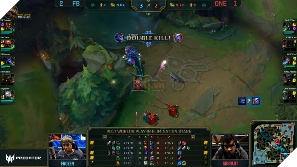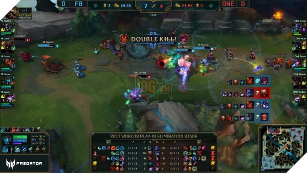 Cuối cùng chúng ta cũng đã được thấy Janna – Tướng hỗ trợ hot nhất giải đấu xuất hiện. Tuy nhiên ONE lại làm mọi người chú ý hơn nữa khi dùng hai con bài vô cùng hiếm gặp là Senjuani đường trên cùng Olaf đi rừng. Nhìn chung đội hình của cả hai bên khá là 50/50 nhưng đa phần vẫn là phụ thuộc vào đường dưới thi đấu ra sao. Bước vào ván đấu lần này thì chiến công đầu lại một lần nữa về tay ONE ở đường trên nhưng mà nạn nhân lại là Crash do một pha đi lạc khá là vô duyên. Có vẻ như bộ đôi Senjuani và Olaf là con bài mà ONE đã giấu kín, họ liên tục có những pha bắt lẻ khá là tốt. Trong khi đó ở đường dưới thì Absolut cùng Redbert lại ép cho bộ đôi phía FB mất phép bổ trợ. Kết quả là ONE nhanh chóng phá được trụ đầu đường dưới sau đó là đường trên. FB có chống trả nhưng cũng yếu ớt và không ảnh hưởng gì nhiều.