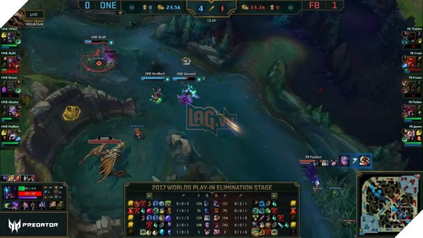 Kết quả của việc này là ONE duy trì được thế trận cân bằng. Khi pha giao tranh tổng đầu tiên diễn ra, lợi thế đã nghiêng hoàn toàn về phía họ. Với ngưỡng sức mạnh cùng lợi thế của đội hình thì ONE nhanh chóng hạ gục hai thành viên của FB và ăn được rồng đất. Sau giai đoạn này FB đã thể hiện sự vượt trội trong khả năng giao tranh của mình khi câu kéo và tránh thoát được việc bị ONE ép giao tranh. Trong một pha bắt lẻ hai thành viên của FB, ONE đã kéo cả 5 người lên nhưng FB lại xoay sở được và câu tới lúc Frozen có thể phá hai trụ đường giữa của đối thủ. Tưởng rằng FB sẽ lấy lại được thế trận nhưng ONE lại lén ăn được con Baron ngay phút thứ 22 trong lúc cả 5 thành viên FB xuống ăn rồng đất.