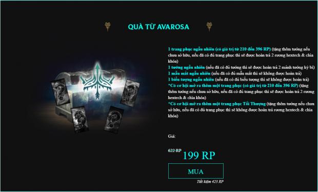 Rất tiếc là nếu đã sở hữu toàn bộ, bạn sẽ không thể nhận thêm bất kì tướng hay trang phục nào từ hộp quà nữa. Tuy nhiên, bạn sẽ nhận lại được những vật phẩm Chế Tạo Hextech khi không còn có thể nhận thêm tướng hay trang phục trong phần quà từ Avarosa như sau: