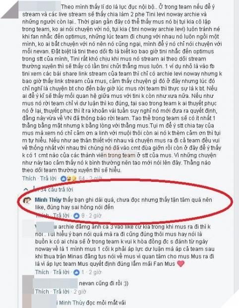 Ngoài ra có một nhận xét khá dài từ một fan thường xem stream Optimus chia sẻ chiếm được sự chú ý của nhiều người. Dường như ở GAM đang có một bè phía vô hình nào đó khiến Optimus bị cô lập với phần còn lại. Ngay sau dòng chia sẻ này bạn gái Optimus – Minh Thùy cũng “like” tuy không cho biết rằng nội dung đó đúng hay sai. Tuy nhiên nếu chuyện này không đúng sự thật, có nghĩa là Optimus không có xích mích gì với các thành viên trong team. Với tư cách là người yêu của cựu tuyển thủ đường giữa GAM, sẽ rất khó có chuyện Minh Thùy thích bình luận này.