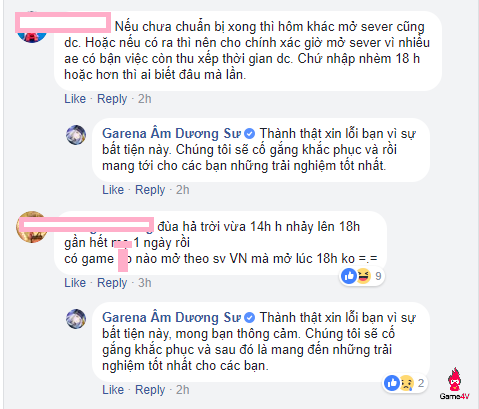 Sau đó, trên trang Facebook chính thức của tựa game, Garena đã phải đưa ra thông báo về thời điểm dự kiến ra mắt Server là vào lúc 14h chiều nay. Tuy nhiên sau đó không lâu, Garena tiếp tục trì hoãn thời điểm ra mắt chính thức sang … 18h. Không chỉ trên Facebook mà khi đăng nhập vào game, người chơi cũng dễ dàng thấy thông báo