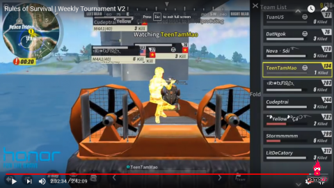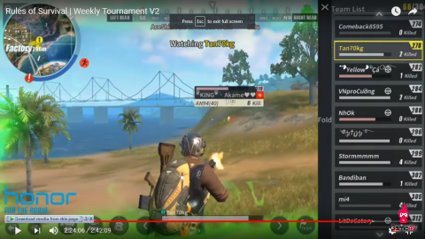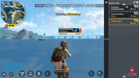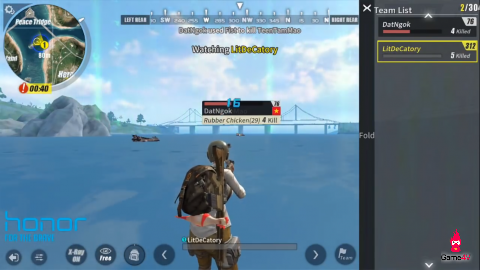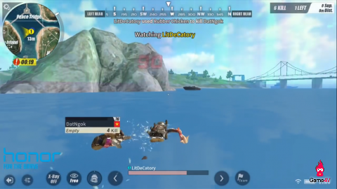 Lúc này player LitDeCatory bắn rất “khét” khi hạ gục player 1 từ rất sớm. Sau đó anh tiếp tục hạ gục thành viên YellowCá, tiếp sau là bắn nổ chiếc thuyền của bộ đôi teamup DatNgok và TeenTamMao. 02 người chơi team up này trong 1 phút hoảng loạn đã đấm nhau chết, chỉ còn DatNgok sống sót với 1/3 cây máu vs LitdeCatory với full máu. 2 players liên tục kiếm những chỗ đất liền để đứng lên bắn nhau nhưng không được vì vòng bo quá nghiệt ngã. Sau một thời gian dài bơi qua bơi lại mệt mỏi, 2 players đã quyết định “choảng” nhau bằng Chipuku. Kết quả LitdeCatory có được chiến thắng với 6 mạng và nhận được tặng phẩm Huawei Honor 7x.