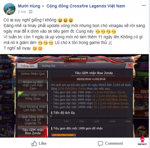 Trên group cộng đồng CF Legends, nhiều phỏng đoán đã được đưa ra về sự chậm trễ này, chẳng hạn VNG muốn chờ ra update mới rồi mới mở vòng quay VIP mới theo thông lệ, phần thưởng vẫn chưa được ấn định, còn một số trục trặc trong phần thưởng thêm… Có ý kiến cho rằng vòng quay VIP bị dời lại để “né” sự kiện tiêu gem tích lũy – game thủ nào vừa muốn quay vòng VIP vừa muốn có cung sẽ phải tốn thêm một khoản kha khá để mở vòng VIP sau này. Nhưng ý kiến này cũng đang gặp nhiều bàn luận trái chiều vì trong 30 ngày mở vòng quay vẫn còn nhiều sự kiện tiêu gem khác, người chơi vẫn có thể đợi được nên chẳng có lý do gì VNG phải “né” sự kiện chồng sự kiện cả.